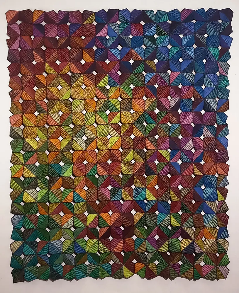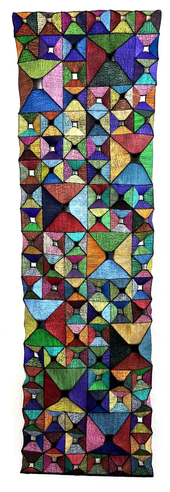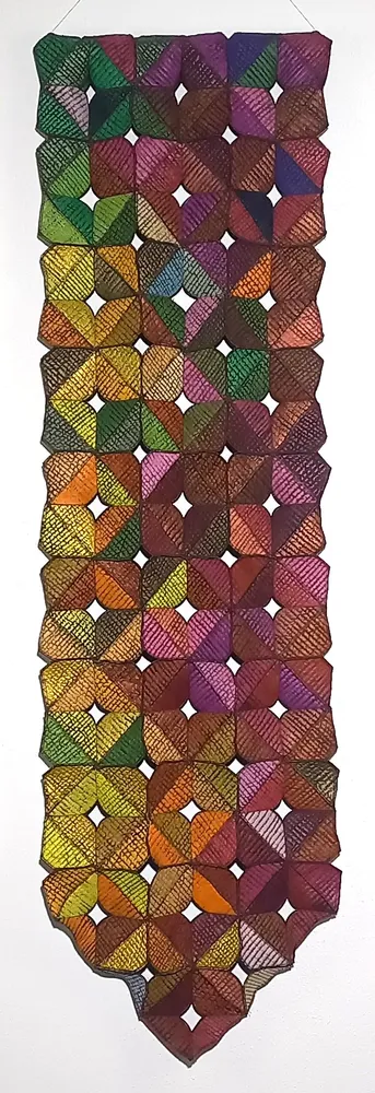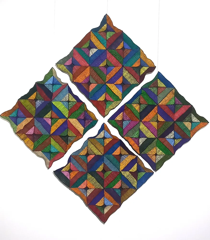 Cette nouvelle exposition propose regards, ouvertures et perspectives multiples. Les œuvres en 3D sont composées principalement de pyramides tronquées aux ouvertures variées. Double face, elles offrent deux expériences spatiales distinctes. Les volumes orientés vers le haut ou vers le bas créent un jeu de lumière et de profondeur invitant à regarder dedans, dehors et à travers. La base reste constituée de lignes libres cousues en piqué libre, fondation structurelle avant l’application d’acrylique et de bâtons à l’huile. La peinture fait émerger un second univers au verso, révélé seulement lorsque le quilt est décroché du mur — un effet de surprise qu’elle affectionne. Chaque face est peinte dans des palettes contrastées, générant deux ambiances émotionnelles. Les inspirations récentes proviennent d’un lever de soleil estival, des compositions florales du Concert du Nouvel An de Vienne, de la pleine lune de janvier ou des tons délicats d’une plage de sable. Dans des temps parfois difficiles, la couleur et le jeu deviennent pour elle une force d’équilibre.