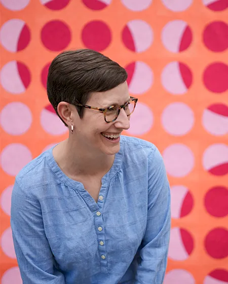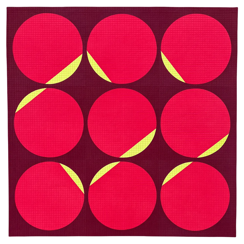 Kelly Spell schafft abstrakte Quilts, die in einer chaotischen Welt Ruhe und Kontrolle herstellen möchten. Ihre Arbeiten verbinden komplexe Techniken mit minimalistischem Design und schöpfen ihre Stärke aus dem Spannungsfeld zwischen Einfachheit und Komplexität. Eine ausgeprägte Neugier prägt ihre künstlerische Praxis. Ihre klaren, grafischen Kompositionen sind vom Mid-Century-Design und der Moderne inspiriert. Kreis- und Schwungmotive vermitteln Harmonie, Energie und Bewegung auf weiten Farbflächen. Häufig entwickelt sie eigene Farbpaletten mit Procion-Reaktivfarbstoffen. Sie lebt in Hixson, Tennessee, und studierte Media Arts and Design. Seit 2014 ist sie autodidaktisch im Nähen tätig. Ab 2021 verlagerte sich ihr Ansatz hin zu stärker prozessorientierter und präziser Arbeitsweise – eine Reaktion auf die Unsicherheiten der Pandemiezeit. Ihre Quilts wurden international ausgestellt, unter anderem im National Quilt Museum (USA) und in der Textilsammlung Max Berk (Heidelberg). Sie erhielt den MQG Award of Excellence sowie den Preis Best Original Modern Design bei QuiltCon 2024.