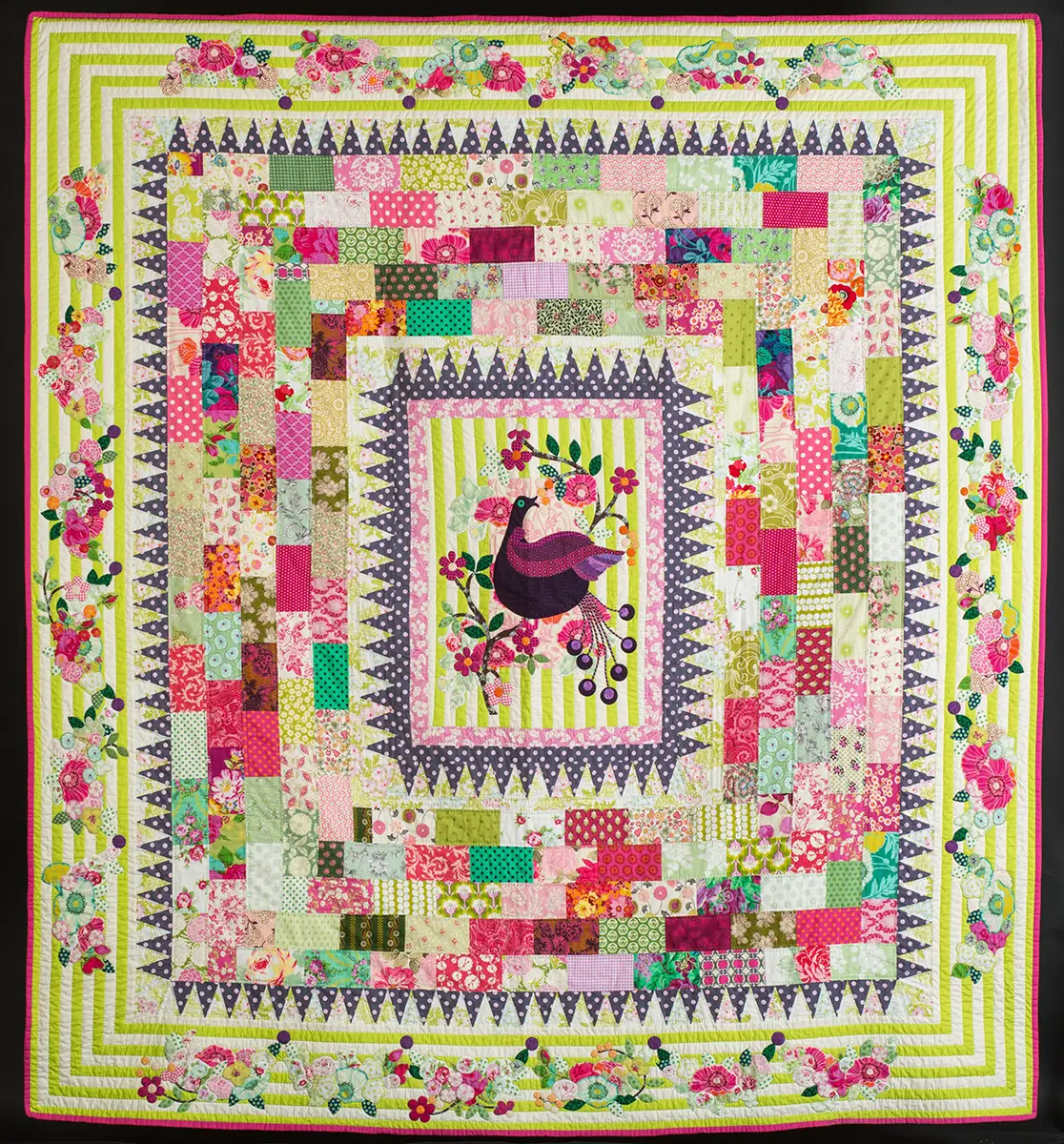 Fiona Lindsey decided years ago to have a theme running through her work. She’s passionate about sewing, but she also has a love for gardening, so it only made sense that these two interests would come together. Over time, her work has developed into a folk art style, deeply inspired by collage and antique textiles. She now paints and collages in scrapbooks to help free up her design process, but her quilts will always hold a special place in her heart.